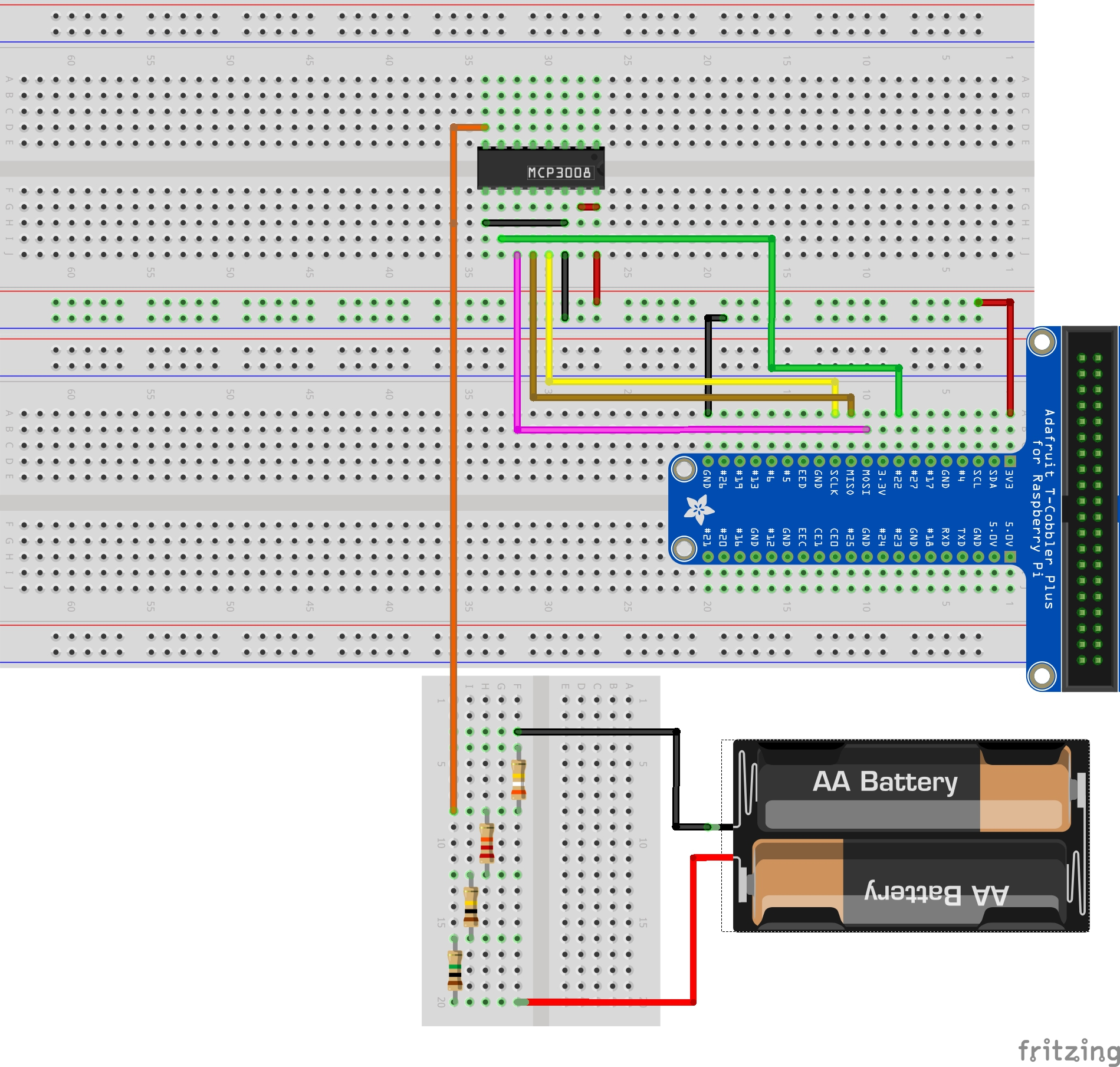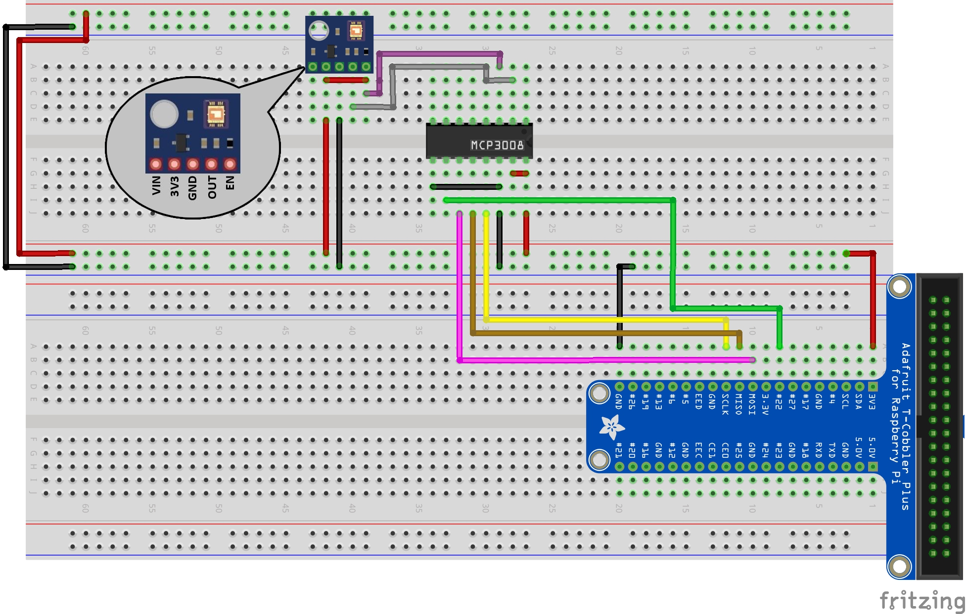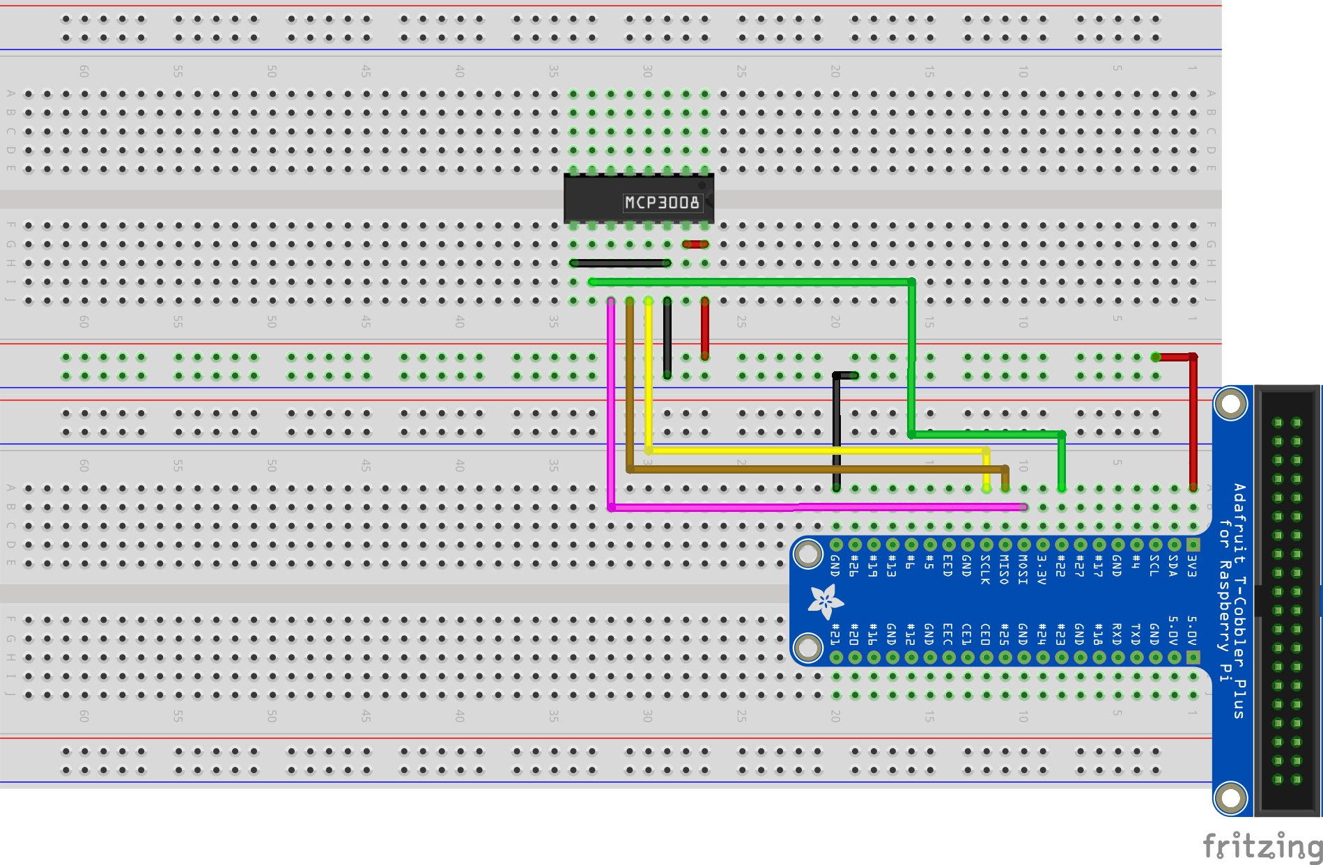 | MCP3008 | 11 | DIN | Cable | RPi | 19 | GPIO10 (MOSI) |