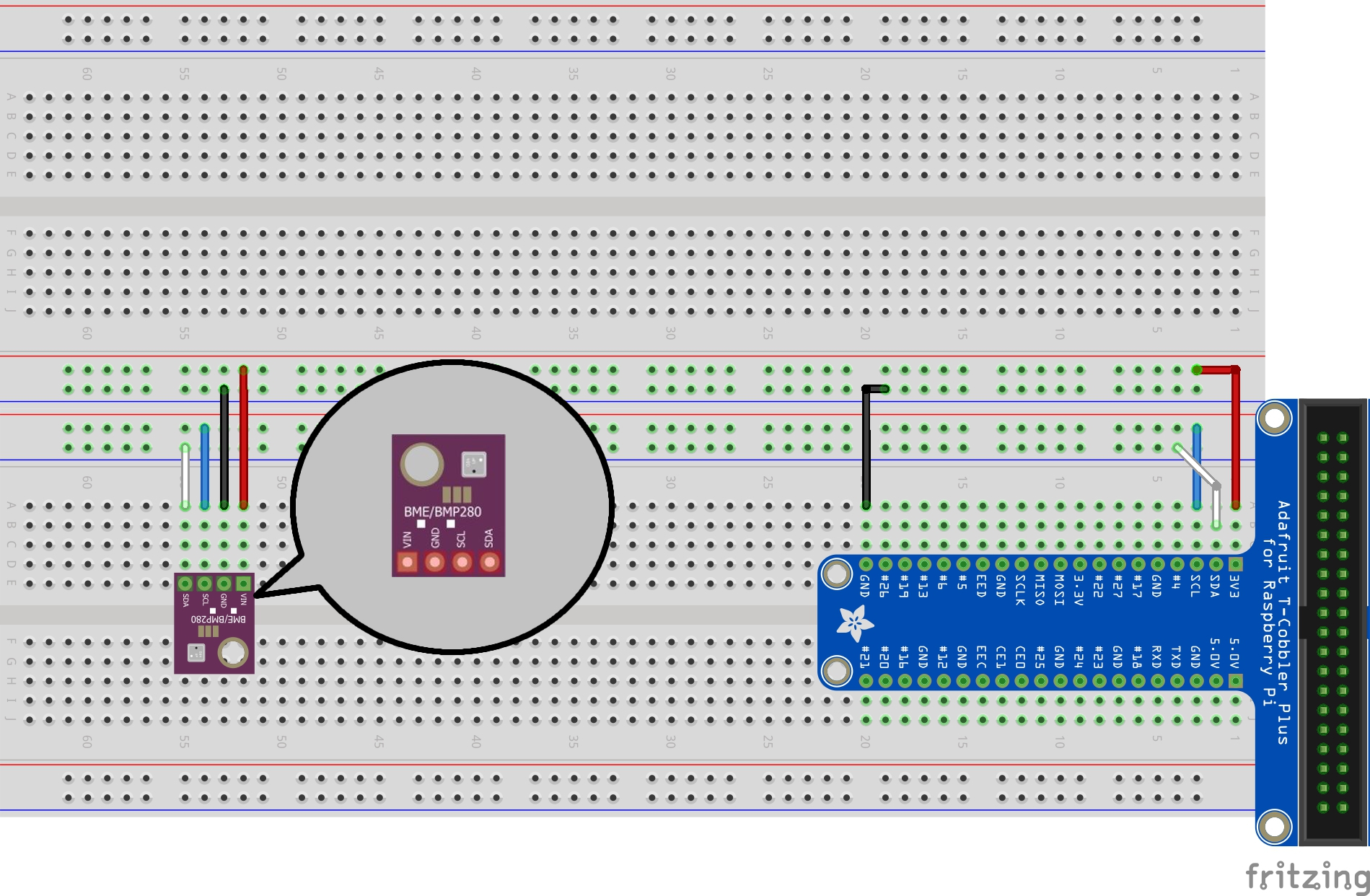 | GY-BME P/280 | N/A | SCL | Cable | RPi | 5 | GPIO3 |