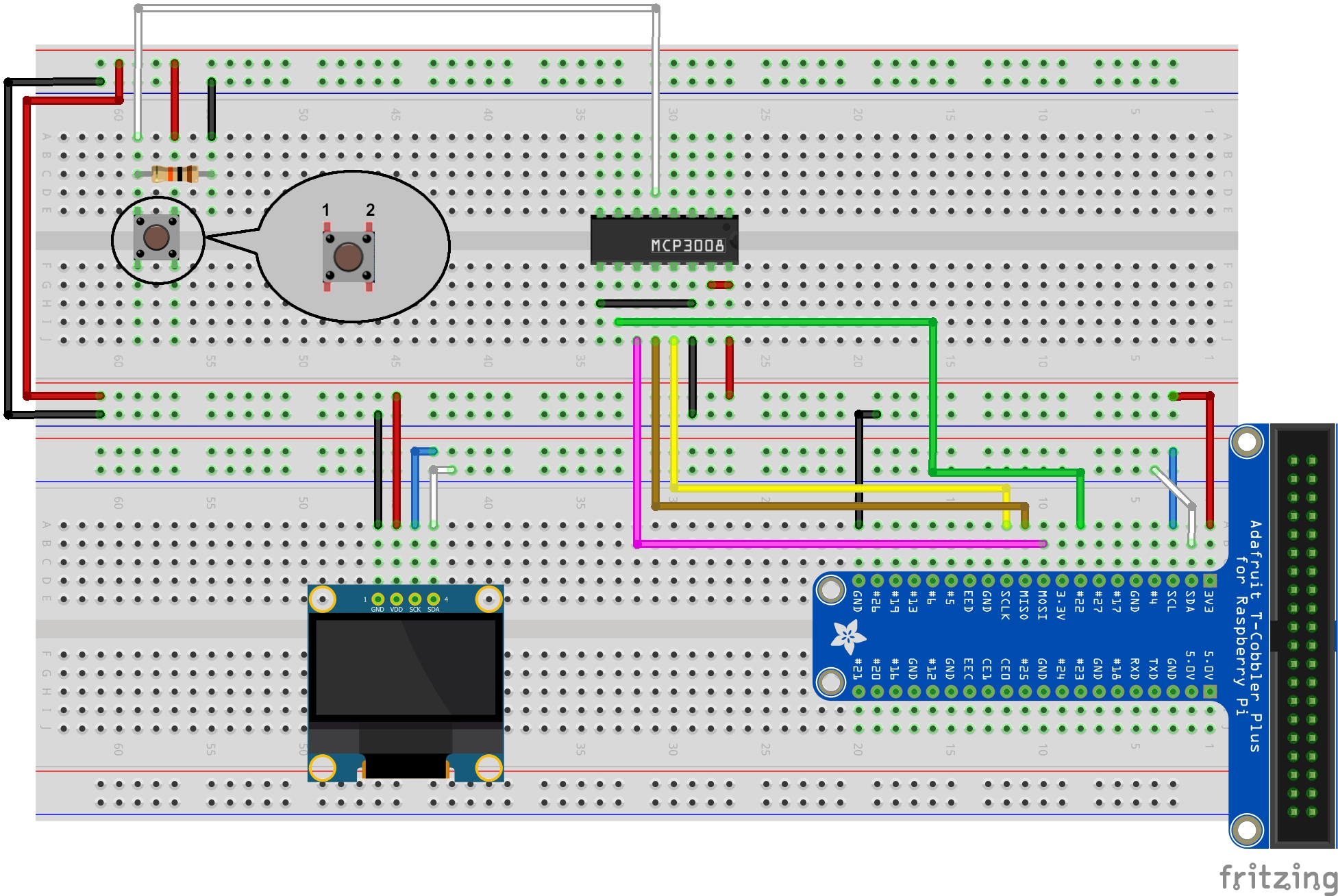 | MCP3008 | 16 | VDD | Cable | RPi | 1 | 3V3 |